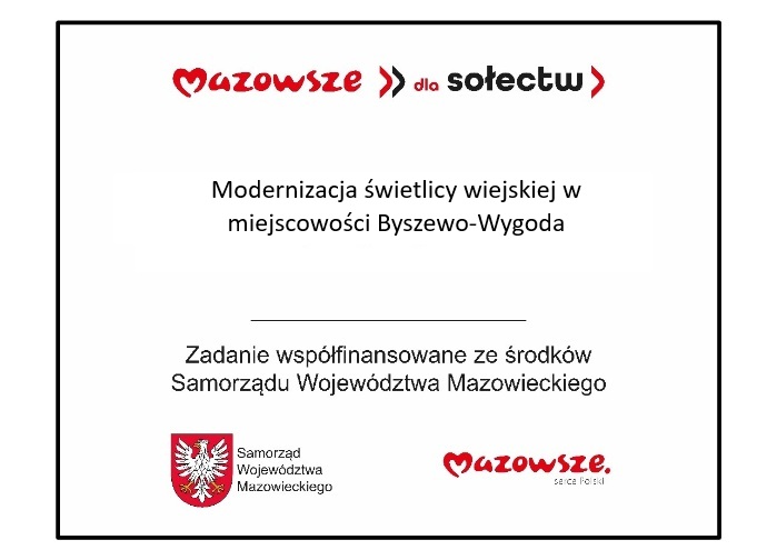 Gmina Karniewo zrealizowała zadanie Modernizacja świetlicy wiejskiej w miejscowości Byszewo – Wygoda. Całkowity koszt zadania 30.000 zł w tym dofinansowanie ze środków Województwa Mazowieckiego 15.000 zł. W ramach zadania wymieniono elewację na budynku świetlicy wiejskiej. Wykonawca zadania – RW-BUD Rafał Wawrzonkowski ul. Leśna 4, 06-425 Karniewo.